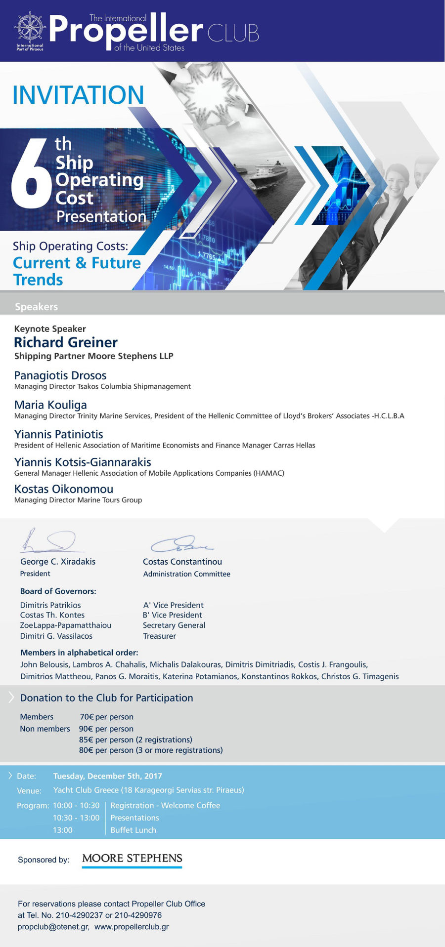 Παρουσιάζει ο Richard Greiner με συζητητές-εισηγητές Panagiotis Drosos TsakosColumbia Shipmanagment, Maria Kouliga Managing Director Trinity Marine Services και President of thye Hellenic Committee of Lloyd's Brokers Associates, Yiannis Patiniotis, Finance Manager of Carras Hellas and President of Hellenic Association of Maritime Economists, Yiannis Kotsis Giannarakis General Manager Hellenic Association of Mobile Applications Companies και Konstantinos Oikonomou, Managing Director Marine Tours Group. Μαζί τους το Team τουPROPELLER CLUB Dimitris Dimitriadis, Dimitris Patrikios, John Belousis, Costis Frangoulis, Costas Kontes, Costas Constantinou, Panos G. Moraitis, Christos Timagenis, Dimitrios Mattheou, Dr.Konstantinos Rokkos, Lambros Chahalis, Zoe Lappa Papamatthaiou.