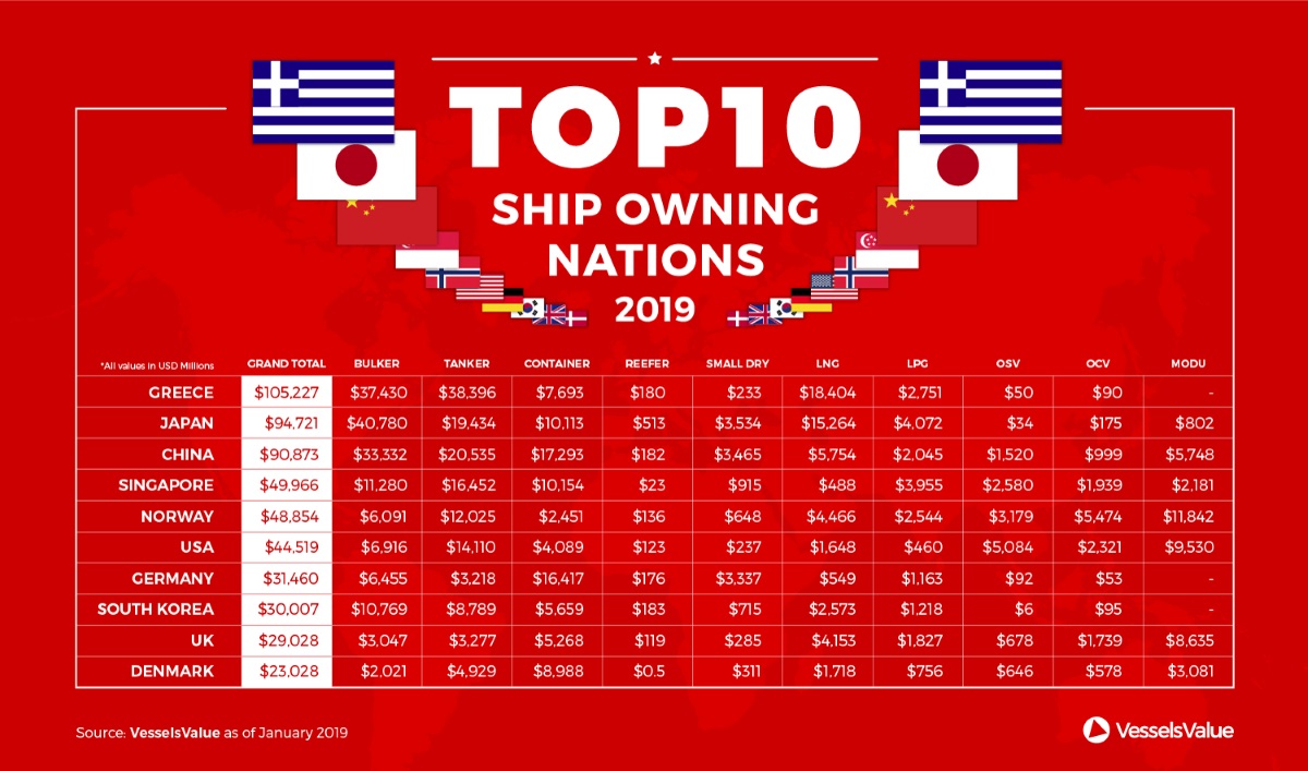 Την δεκάδα με τις χώρες που κατέχουν τον μεγαλύτερο σε αξία στόλο παγκοσμίως συμπληρώνουν η Σιγκαπούρη με 49,9 δις δολάρια , η Νορβηγία με 48,85 δις δολάρια , οι ΗΠΑ με 44,52 δις δολάρια , η Γερμανία με 31,4 δις δολάρια , η Νότια Κορέα με 30 δις δολάρια , το Ηνωμένο Βασίλειο με 29 δις δολάρια και η Δανία με 23 δις δολάρια.