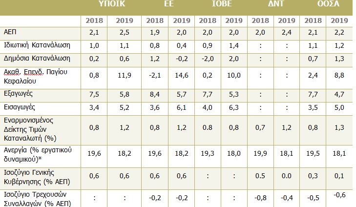 Πηγές: Εισηγητική Έκθεση Κρατικού Προϋπολογισμού 2019, Υπουργείο Οικονομικών, Νοέμβριος 2018 – European Economic Forecast, autumn 2018, European Commission, Νοέμβριος 2018 - Η Ελληνική Οικονομία 04/18, IOBE, Ιανουάριος 2019 – World Economic Outlook, IMF, Οκτώβριος 2018 - Fiscal Monitor, IMF, Οκτώβριος 2018 - OECD Economic Outlook No. 104, Νοέμβριος 2018