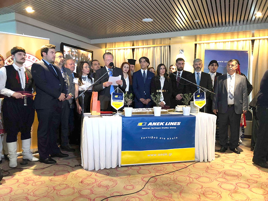 Ο κ. Γ. Μαριδάκης, πρόεδρος της «Παγκρητίου Ενώσεως», καλωσόρισε τους παρευρισκόμενους και ευχήθηκε σε όλους υγεία και ευτυχία και ένα όμορφο 2019, υπογραμμίζοντας: «Σήμερα, βρισκόμαστε ξανά όλοι μαζί πιστοί στο καθιερωμένο μας ραντεβού. Για μια ακόμα χρονιά ανταμώνουμε, ανταλλάζουμε ευχές, γιορτάζουμε με ήχους, εικόνες και γεύσεις από την πατρίδα. Γι` αυτό εδώ και χρόνια επιλέγουμε την φιλοξενία της ΑΝΕΚ LINES που περιβάλλει την ετήσια συνάντησή μας με φιλόξενη μέριμνα, έτσι όπως μόνο στην Κρήτη γνωρίζουμε ».