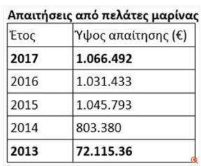 -1,07 εκατ. ευρώ από πελάτες της μαρίνας Αγ. Κοσμά, όταν η συγκεκριμένη απαίτηση διαμορφωνόταν μόλις σε 72,1 χιλ. ευρώ το 2013. Η Ελληνικό αναφέρει ότι οι εμπορικές απαιτήσεις είναι αυξημένες σε σχέση με τη χρήση του 2016 επειδή αυξήθηκε ο κύκλος εργασιών της μαρίνας Αγ. Κοσμά. Να σημειωθεί ότι το 2014 η τότε διοίκηση της Ελληνικό Α.Ε. απέδωσε την αύξηση των απαιτήσεων στο γεγονός ότι η μαρίνα παραλήφθηκε μόλις στις 14 Οκτωβρίου 2013, "με συνέπεια στις καταστάσεις να έχει σχηματιστεί πρόβλεψη δεδουλευμένων εσόδων”.