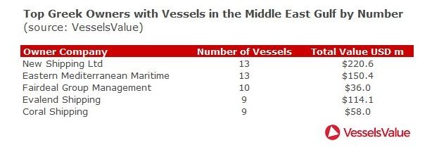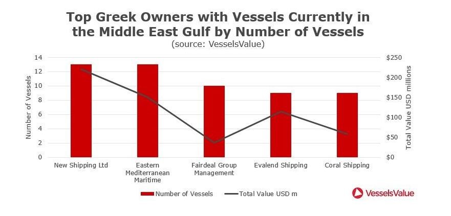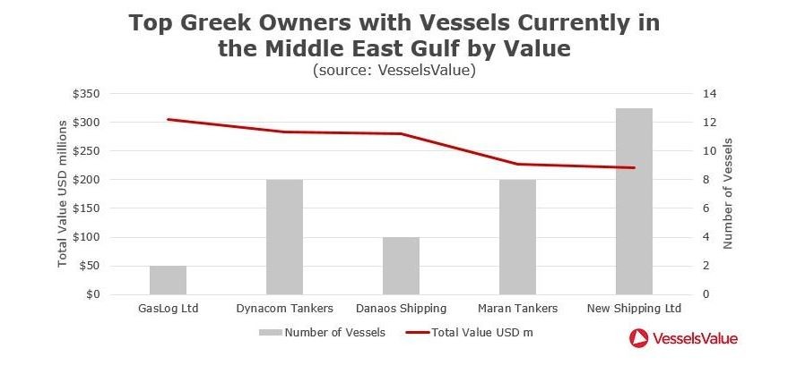 Αρκετοί Έλληνες εφοπλιστές έχουν, στην παρούσα φάση, δεξαμενόπλοια που βρίσκονται στην περιοχή της Μέσης Ανατολής. Η VesselsValue επεξεργάστηκε αναλυτικά στοιχεία για τον αριθμό των πλοίων αλλά και την αξία τους ανά εταιρεία. Ωστόσο, διευκρινίζει ότι δεν είναι γνωστός ο λόγος για τον οποίο κάθε τάνκερ βρίσκεται στη συγκεκριμένη περιοχή.