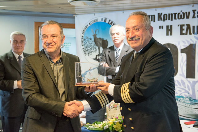 | Ο πλοίαρχος του "ΚΡΗΤΗ ΙΙ" κάπτεν Γιάννης Λυγεράκης ενώ παραλαμβάνει αναμνηστικό δώρο από τον Αντιπρόεδρο του "Συλλόγου Καντανιωτών" κου Ευτύχιο Θεοδωράκη. |