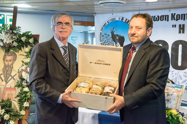 | Ο Αντιπρόεδρος της ΑΝΕΚ LINES κος Σπύρος Πρωτοπαπαδάκης ενώ προσφέρει ως δώρο κρητικά παραδοσιακά προϊόντα στον Πρόεδρο της 'Ενωσης Κρητών Σελίνου Αττικής "Η Έλυρος" κο Ευτύχη Καστρινάκη |