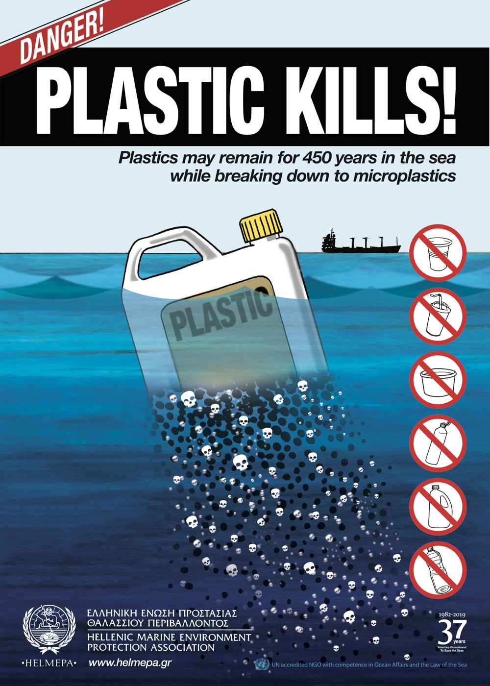 Η τρίτη αφίσα στέλνει το μήνυμα “Plastic Kills” στους ναυτικούς πάνω στα πλοία Μέλη, σε όλα τα πλάτη και μήκη της Γης! Θυμίζει πως κάθε πλαστικό που πέφτει στη θάλασσα δεν εξαφανίζεται αλλά διασπάται για χρόνια, ενώ τα πολύ μικρά κομμάτια του, τα μικρο-πλαστικά, καταστρέφουν τη θαλάσσια ζωή.