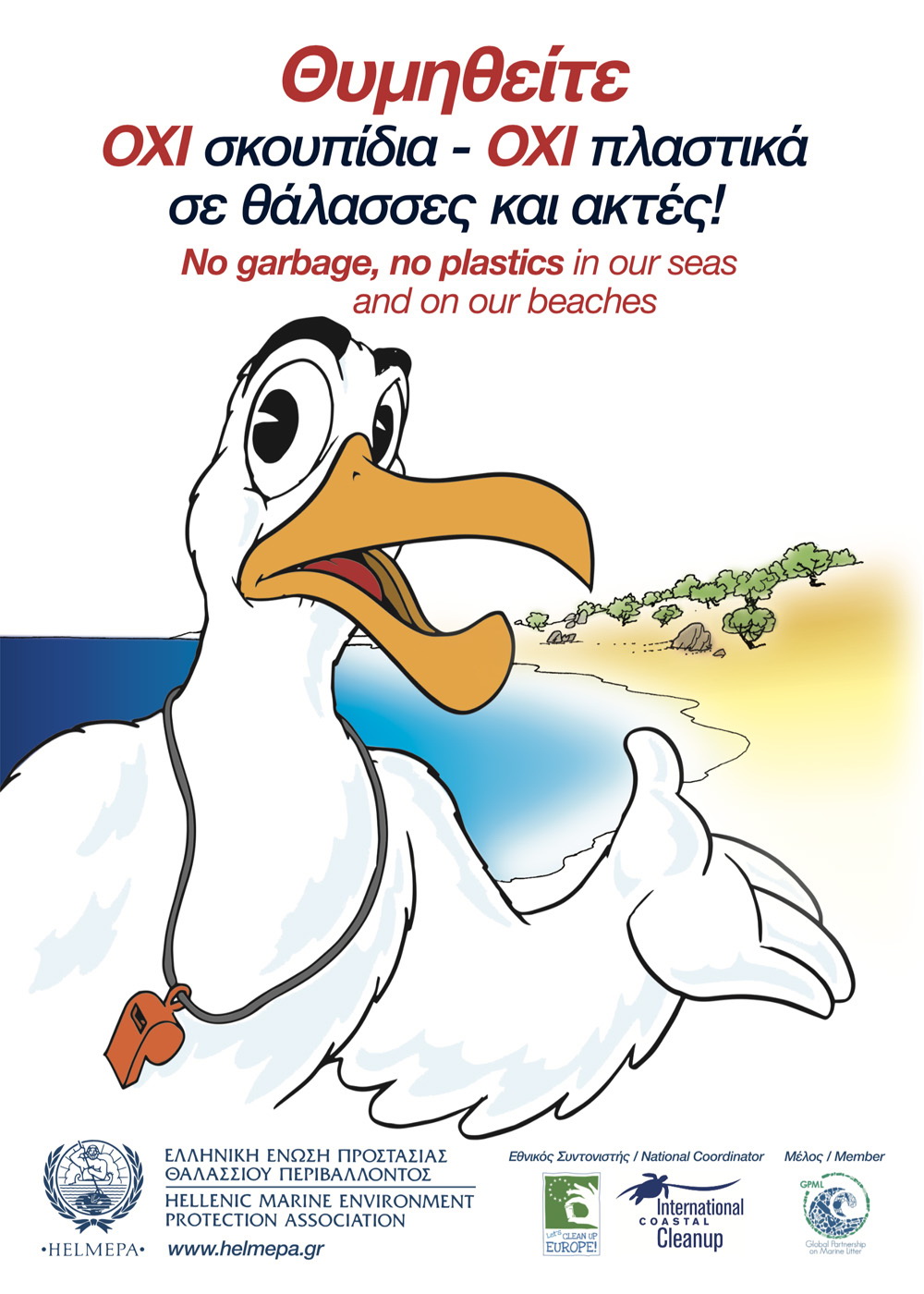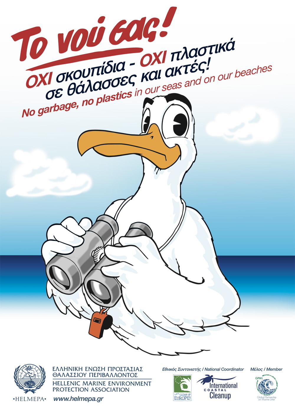 Οι δύο αφίσες, με πρωταγωνιστή το «Γλάρο», επαναλαμβάνουν σε εμάς που ζούμε στη στεριά το ιστορικό πια σύνθημα της HELMEPA «ΌΧΙ σκουπίδια - ΌΧΙ πλαστικά σε Θάλασσες και Ακτές!». Περίπου 6.000 μαθητές, που είναι Μέλη του Προγράμματος «Παιδική HELMEPA», θα τις αναρτήσουν σε γειτονιές, σχολεία και παραλίες των περιοχών τους. Επίσης, αναλαμβάνουν ευγενικά τη διανομή τους Λιμεναρχεία, ΟΤΑ, Σύλλογοι, Ναυτικοί Όμιλοι, Ναυτικά Μουσεία και άλλοι συνεργαζόμενοι φορείς.