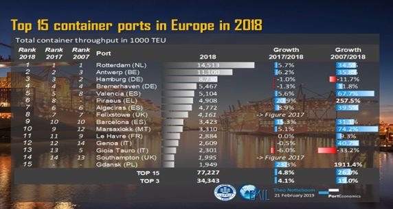 Επίσης, σύμφωνα με τα στοιχεία της Alphaliner οι 104 από τους συνολικά 120 μεγαλύτερους λιμένες του κόσμου κατέγραψαν για το 2018 αύξηση στην διακίνηση εμπορευματοκιβωτίων