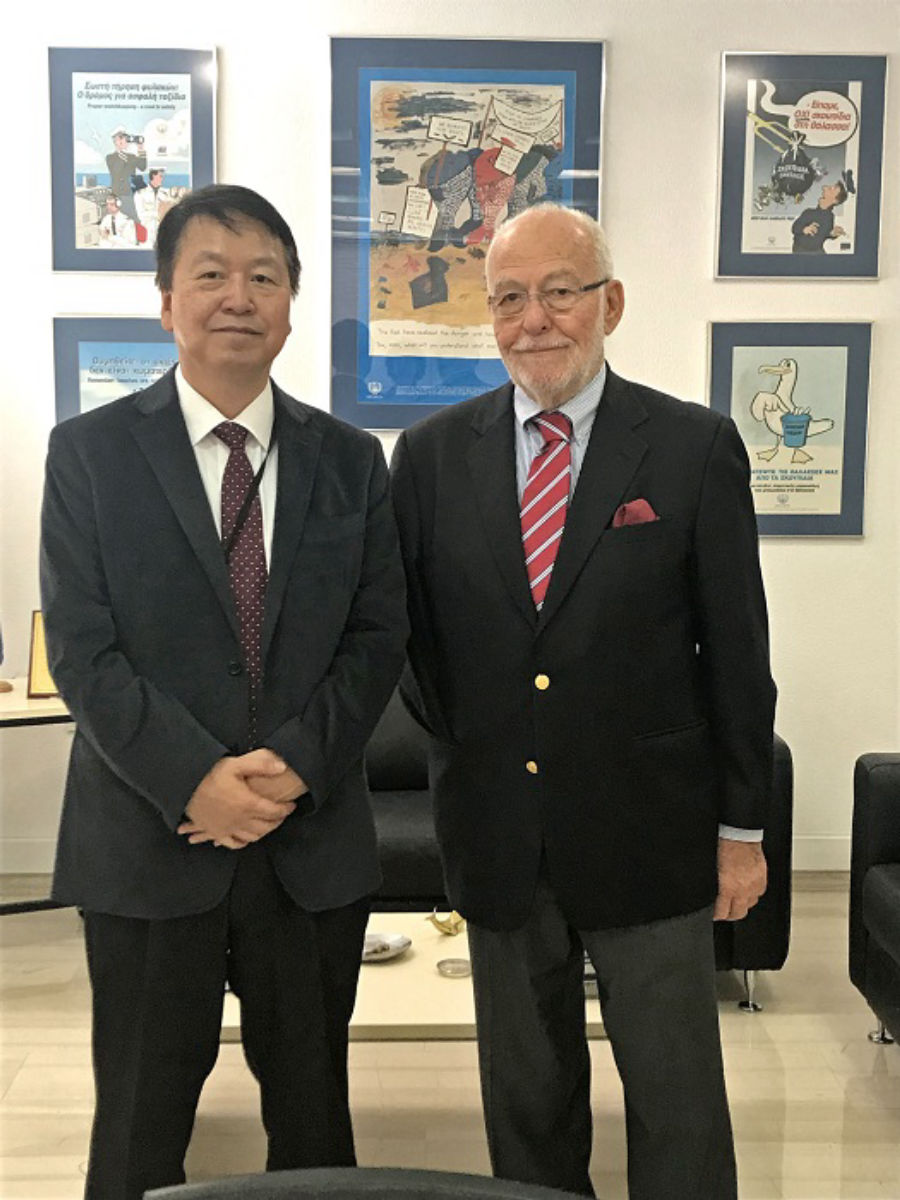 | H A.E. ο Πρέσβης της Ιαπωνίας, κ. Y. Shimizu με το Γενικό Διευθυντή της HELMEPA, κ. Δ.Κ. Μητσάτσο, στα γραφεία της ένωσης |