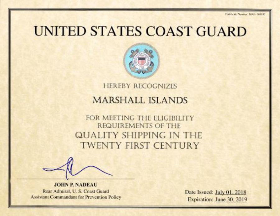 «Το Νηολόγιο των Νήσων Μάρσαλ καταβάλλει κάθε δυνατή προσπάθεια για να διατηρήσει αυτό το ποιοτικό καθεστώς με την Αμερικανική Ακτοφυλακή, το οποίο βοηθά τους πλοιοκτήτες και εφοπλιστές μας να λάβουν αυτή την μοναδική πιστοποίηση.» επισημαίνει ο κ Ξενακούδης. Από τις 2 Μαΐου 2019, 862 σκάφη του στόλου του νηολογίου των Νήσων Marshall είναι μέλη σε αυτό το σημαντικό θεσμό ποιότητας.