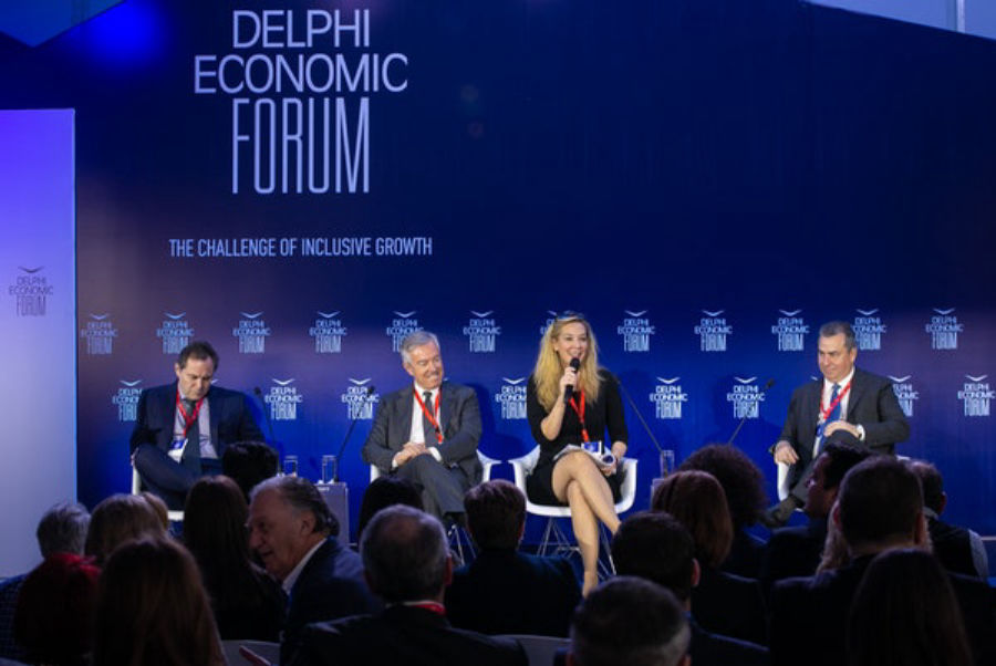| Από τα δεξιά κάθονται ο κ. Αχιλλέας Β. Κωνσταντακόπουλος, Πρόεδρος ΤEMES S.A., η κα Μαρία Νικόλτσιου, συντονίστρια της συζήτησης, ο κ. Ανδρέας Ανδρεάδης, Διευθύνων Σύμβουλος του ομίλου SANI S.A. και ο κ. Ευτύχιος Βασιλάκης, Πρόεδρος της Aegean Airlines, Διευθύνων Σύμβουλος της Autohellas |