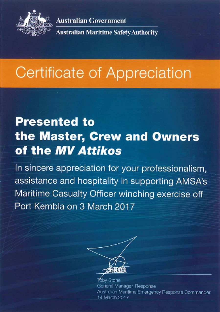 Mr. Toby Stone, General Manager, Response, Australian Maritime Emergency Response Commander, presented to the Master, Crew and Owners of the M/V ‘Attikos’ a Certificate of Appreciation “for your professionalism, assistance and hospitality in supporting AMSA’s Maritime Officer Winching exercise off Port Kembla on 3 March 2017”.